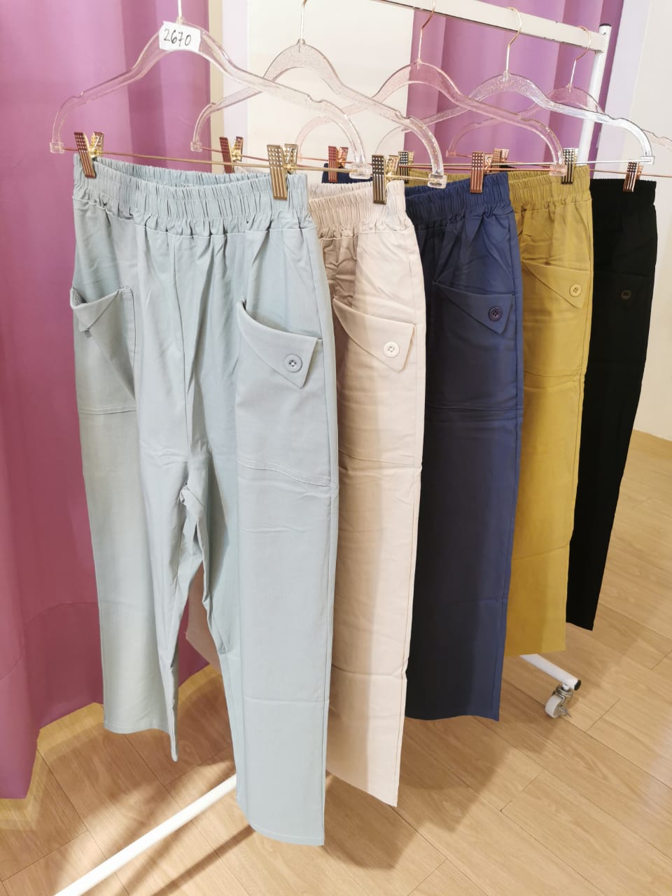 2670 七分裤窄脚百搭裤 Lycra布料有弹性 两侧有口袋 Waist 平量24寸可拉到46寸 臀 100cm (可拉到50寸) 裤长 85cm 颜色 黑 黄 蓝 青 杏
